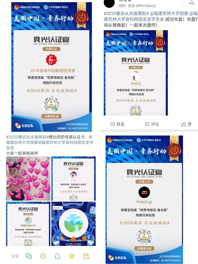 4月22日,团中央发起了“2020重启,从光盘做起”线上接力活动,为响应国家“光盘”号召,食品科学学院积极宣传和动员,鼓励学生用餐后通过AI识别餐盘,获得“食光认证卡”,并邀请好友参与接力挑战。本次活动以线上传递的方式,通过朋友圈或微博端打卡,鼓励学院学子开展“光盘行动”,呼吁大家一起用行动抗疫情,传递正能量。此次活动旨在让更多学生树立节约光荣的理念,自觉养成餐桌文明新风尚,做杜绝浪费的倡导者和实践者。为消除奢侈浪费之风,弘扬中华民族勤俭节约美德做奉献。