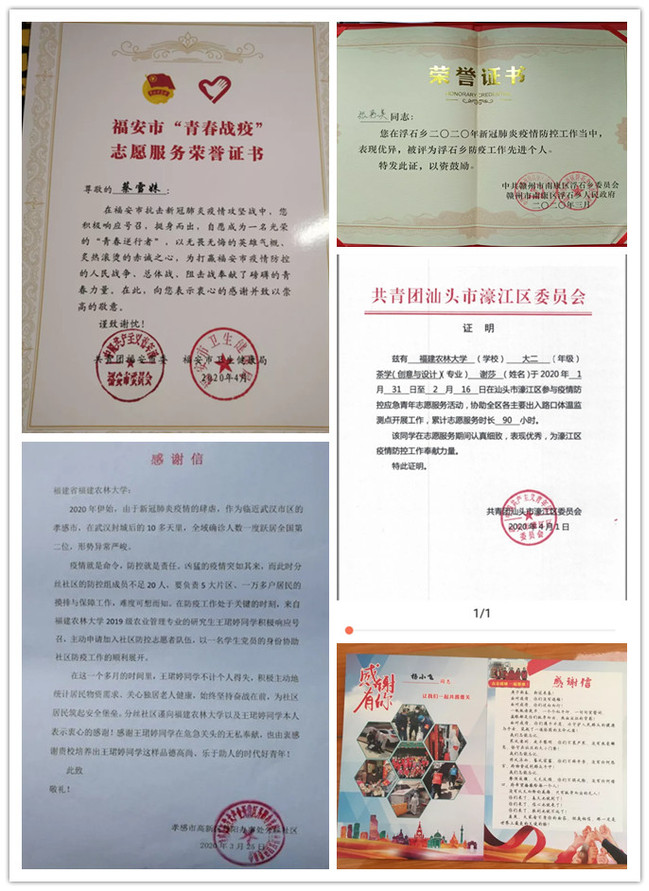 除此之外,还有很多积极参加疫情防控的茶院学子同样发挥着榜样的力量。2017级管理科学专业3班的张惠美在疫情期间报名参加了乡村疫情防控志愿者工作、2019级管理科学专业3班的蔡雪妹也积极参与了福安市的抗疫活动,并获得了福安市“青春战疫”志愿服务荣誉证书。“家乡防控缺人手我就上,帮一下忙,尽一份力。”同样参加志愿活动的2018级茶学(创意设计方向)专业3班的谢莎说到。