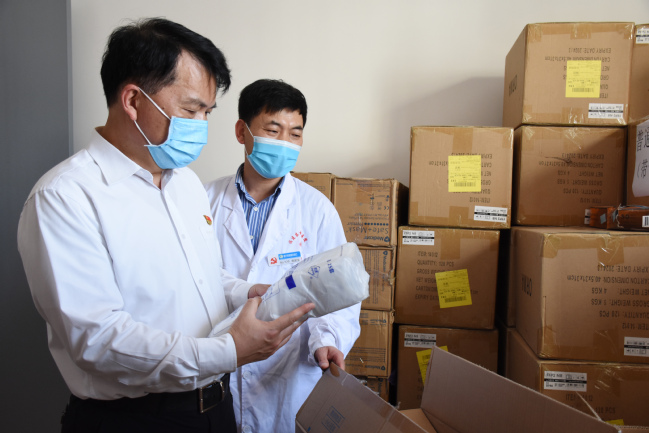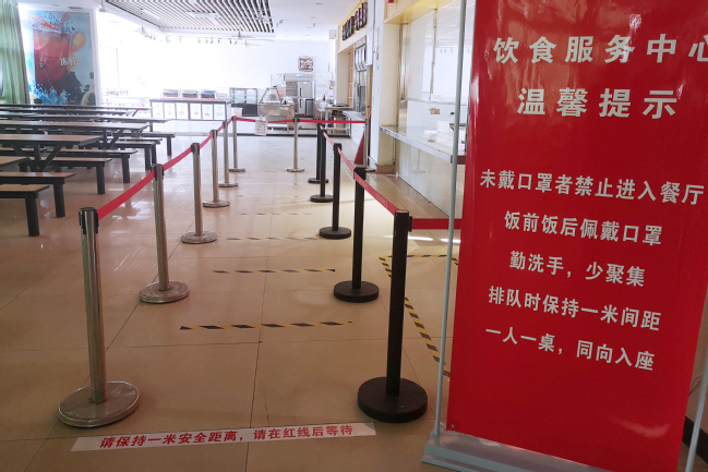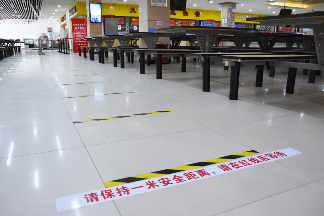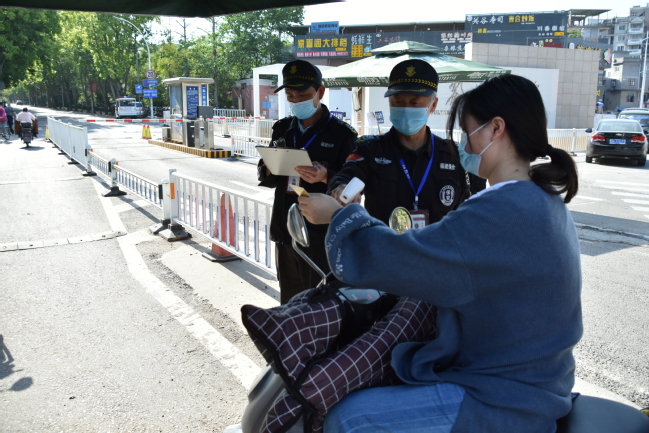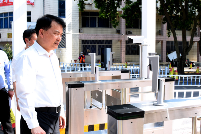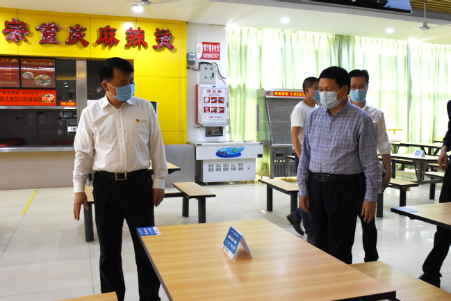 严金静一行先后察看了校西门靠三环路一侧围挡,西二门和东二门门禁系统建设,“学生街”门区建设情况,亲自体验入校人脸识别测温系统,深入了解车辆及人员入校管控措施;在校医院和后勤处,实地查看了口罩、酒精、消毒液等防疫物资储备情况;在南区第九食堂检查了食品卫生安全及引导排队、就餐等各类标识设置情况;在原南区9号危房拆除现场,察看了后期运动场所建设情况。