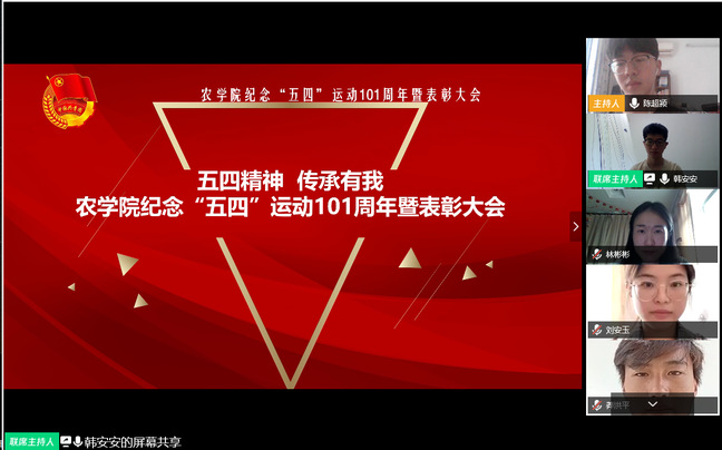 5月3日下午,农学院于线上召开了纪念五四运动101周年暨五四表彰大会。学院团委书记林彬彬、团委学生会主要学生干部、各班团支书、受表彰集体代表和个人等110多人参加会议。会议由学院团总支书记陈超颍主持。