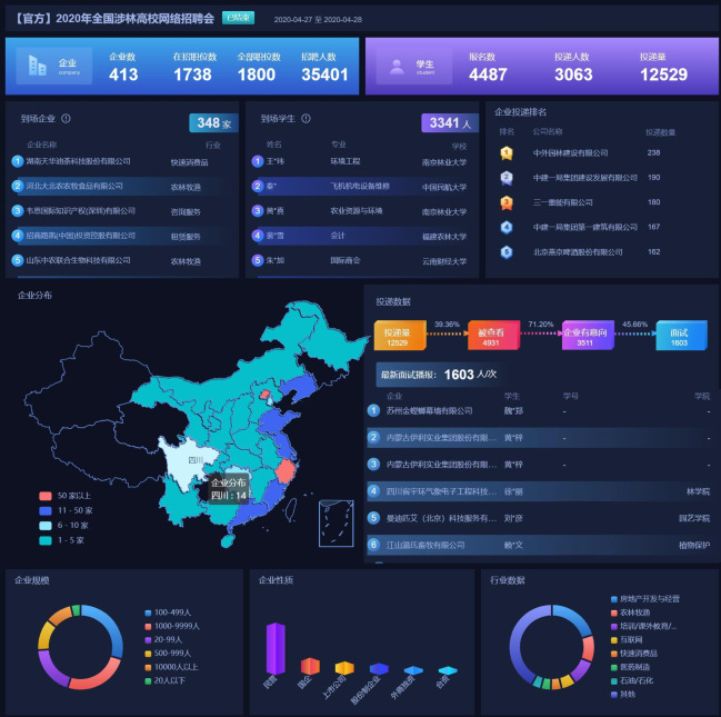 本场招聘会共吸引了全国413家知名企业参会,其中国有企业和事业单位占比15%,上市公司占比9.7%,民营企业占比56.9%;企业规模1000人以上占比35.1%,企业规模100-1000人占比40.9%;共为毕业生提供了35400多个就业岗位,涵盖了农林牧渔业、石油化工、教育、批发和零售业、制造业、建筑业、金融业、房地产业、住宿和餐饮业、信息传输、软件和信息技术服务业、交通运输仓储和邮政业、水利环境和公共设施管理业、科学研究和技术服务业、居民服务、文化体育和娱乐业、租赁和商务服务业等各个行业领域。据平台统计,本场网络招聘会的毕业生参与数为4487人,简历投递12529份。