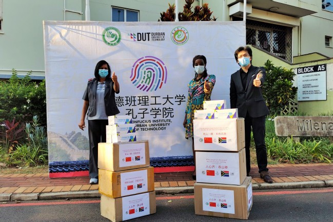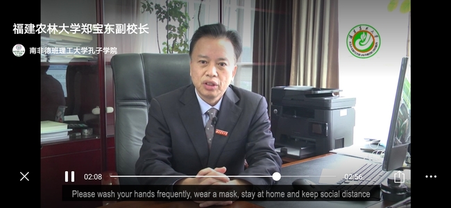 自3月份南非爆发疫情以来,学校十分关心南非当地防疫工作开展情况及德班孔院在岗教师的身心健康。在南非实行全国封禁期间,副校长郑宝东向德班理工大学及其孔院发去慰问视频。得知德班理工大学缺少防护口罩,学校多方联络物资,积极为德班理工大学提供帮助与支持。