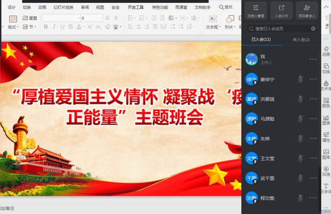 6月3日晚,经济学院11名第二批返校的硕博士研究生运用腾讯会议平台开展以“厚植爱国主义情怀,凝聚战疫正能量”为主题的班会。