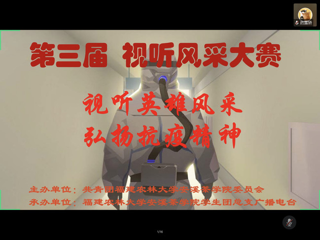 面对突如其来的疫情,全国人民团结协作、戮力同心、无私奉献、英勇斗争,凝聚起了抗击疫情的强大中国精神和中国力量。为让同学们学习英雄事迹、弘扬抗疫精神,6月3日-15日,安溪茶学院举办了“视听英雄风采,弘扬抗疫精神”第三届视听风采大赛。大赛现场此次比赛以配音和文稿两种作品形式进行征集,比赛分为初赛、复赛两个阶段,采用线上方式组织开展。经激烈角逐,最终,陈星星、许佳丽、吴家怡、曹春同学分获配音秀类一、二、三等奖,石彬洁、李甜甜、杨仕莲同学分获文稿类一、二、三等奖。