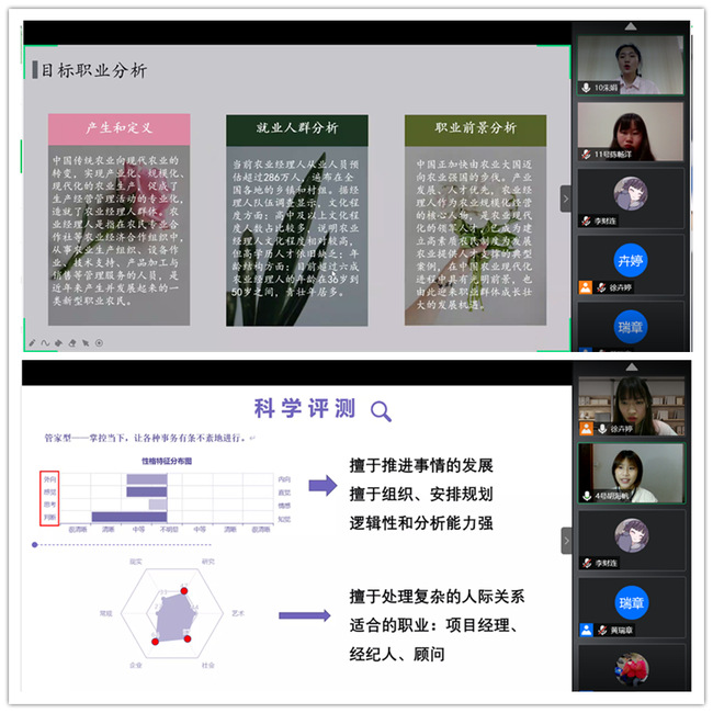 本次大赛以“职言职语,战“疫”前行”为主题,分个人展示和评委提问两个环节,每位选手按抽签顺序依次进行个人展示和答辩。个人展示过程中,每位选手都认真通过对职业环境的分析、自我认知分析后确定目标职业,并详细制定出职业生涯短、中、长期目标和具体的实施计划。评委根据学生的阐述以及规划方案设计进行提问。