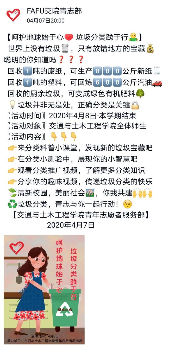 近日,交通与土木工程学院在线开展了主题为“呵护地球起初心,垃圾分类践于行”的校园垃圾分类志愿活动。