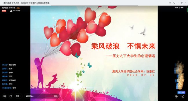 为更有效的缓解疫情给大学生带来的冲击,第十五届“5.25”心理健康月系列活动之心理健康系列讲座通过云端举办并圆满完成,本次系列讲座有效缓解了疫情给大学生带来学习、就业、生活等方面的影响,促使大家变压力为动力,调整好自己,适应新的平衡。