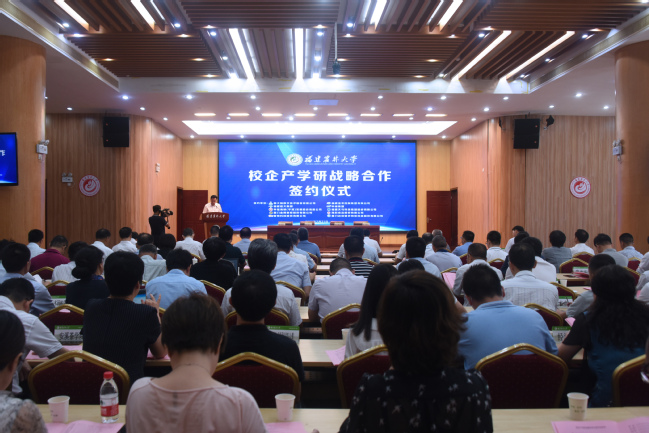 校党委书记严金静代表学校致辞。他指出,高校承担着人才培养、科技创新和服务社会的重要使命,办好一所大学,归根到底在于培养出高素质的人才。全方位深化校企合作,为办好大学、培养好人才提供了广阔的空间和舞台。下一步,学校将坚持以社会和市场为导向,建立有效的用人反馈机制,推进课程设置、专业设置和学科结构调整,以需求引领设置新专业,改造和淘汰落后专业,不断提高人才培养的社会匹配度;将借助企业的优势和平台,着力拓展人才培养新空间,通过建立长期稳定的实践实习基地,引导学生走出校园,在生产实践中得到磨炼和提升,不断提高实际动手能力,提高综合素质;将强化与企业的协同创新,深化产教融合、校企合作,围绕地方主导产业、支柱产业和战略新兴产业,聚焦智慧农业、海洋生物、新材料、新能源等领域加强科研攻关,不断提升科技创新水平,推动科技成果转化,为地方经济社会发展提供有力科技支撑。