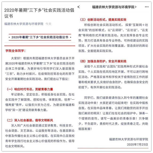 倡议书号召学院全体同学要牢记使命,坚定信念,积极投身社会实践,在社会实践中了解国情、感知社情、体察民情,培养“一懂两爱”情怀,以强农兴农为己任,为建设新福建和学校“双一流”建设贡献青春力量。倡议书建议全体同学要深入到广大社会基层通过宣讲教育、科技支农、社会调查、文艺演出、公益服务等活动,在基层群众中普及传播社会主义核心价值观,在实践中凸显我校青年学生践行社会主义核心价值观的积极作为,倡导社会文明新风;要积极创新社会实践活动形式,探索“互联网+社会实践”的创新模式,以“云调研”“云访谈”“云支教”等网络形式开展实践活动;要充分发挥各自专业优势,努力打造具有各自专业特色、可持续建设的实践项目,扩大社会实践的有效覆盖面,营造良好的舆论氛围,全面提高实践实效;要严格落实省市和学校关于疫情防控工作的部署和相关要求,扎实做好自身防护,在确保自身安全的前提下,有序开展社会实践活动。