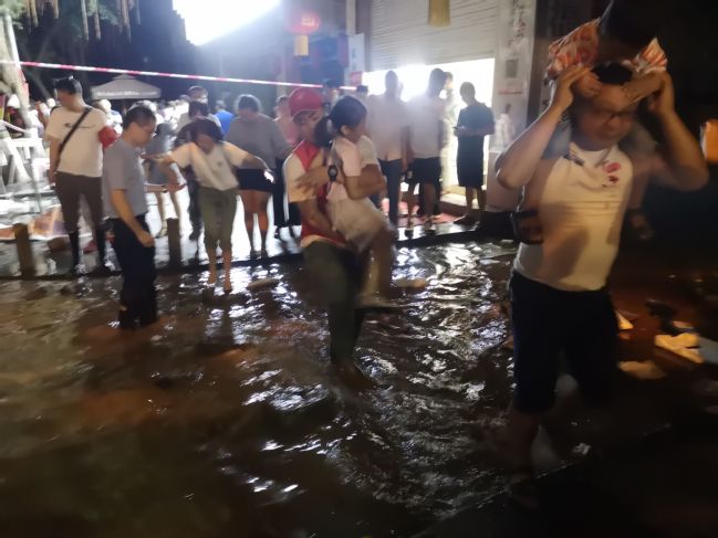 研支团成员第一时间跳入水中抱起被困市民通过积水路口