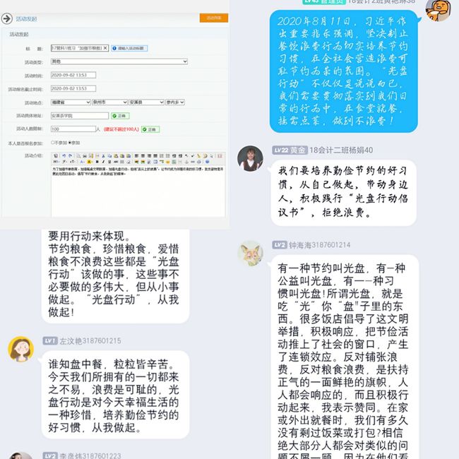 本次活动采取线上线下相结合的方式,线上,学院组织各班级团支部于qq群开展光盘行动交流会。线下则通过海报,倡议书,宣传单以及“光盘合影”等多种宣传角度,向同学们传达适量购取,文明就餐,打包不可耻,浪费不可取的节约思想。