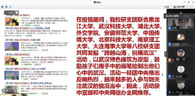 本次宣讲会由校团委主办,第21届研究生支教团承办。21届研支团成员张皓乙、涂皓珉、宋一婧、杨钇、温小婷、江慧、张丹萍、黄国星8人从项目总体情况、服务地情况、支教现状、品牌活动、岗前培训、福利保障、选拔流程和感悟分享等八个方面对我校研究生支教团项目的各个方面进行了详细的讲解,展现了我校研支团立足新时代,展现新作为的良好风貌。“很荣幸能和学弟学妹们分享我们的支教心得,希望能给你们带来实质性的帮助,也希望符合条件的同学积极报名,一同加入我们支教团的大队伍中来。”队长张皓乙说道。分享结束后,还安排了45分钟的线上实时答疑环节,针对同学们的提问进行一一解答。“听了学长学姐们的故事,感觉支教是一件很有意义的事情。希望我也可以加入这个队伍,给当地的孩子们带去我的光和热。”参加宣讲的陈同学说道。为做好今年的招募工作,除了线上召开宣讲会以外,校团委还组建了一个第23届研支团招募咨询QQ群,由21届研支团成员轮班为同学们解答。目前,该群已经吸引了120余名同学加入。