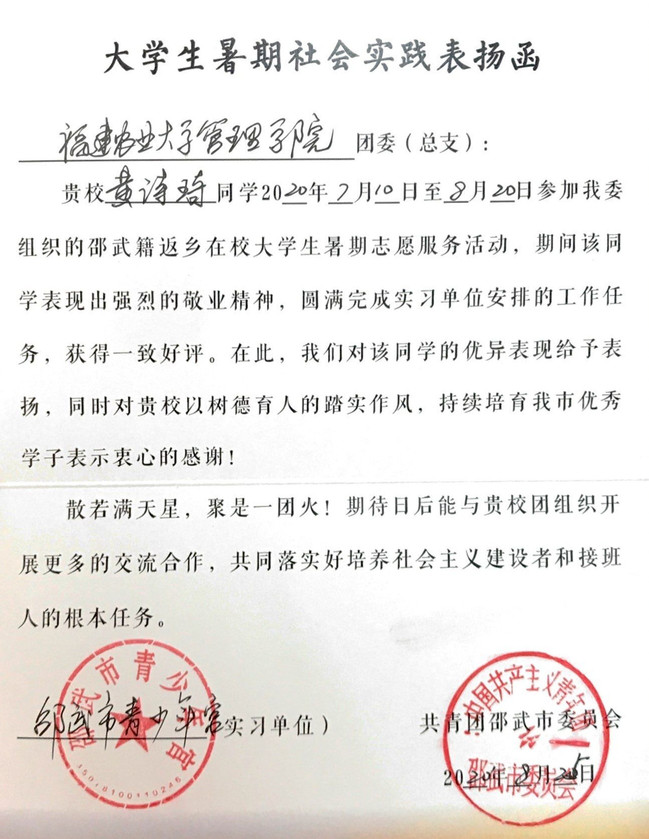近日,管理学院收到共青团邵武市委员会发来的大学生暑期社会实践表扬函,给予参加邵武籍返乡在校大学生暑期志愿服务活动的2019级工商管理专业黄诗琦同学高度评价。表扬函原件信中提到,黄诗琦同学在暑假期间表现出强烈的敬业精神,圆满完成实习单位安排的工作任务,获得一致好评。据悉,管理学院一直高度重视寒暑假社会实践,积极引导青年学生到基层中去、到实践中去,从实践中汲取营养,在锻炼中增长才干,努力成长为社会主义合格建设者和可靠接班人。