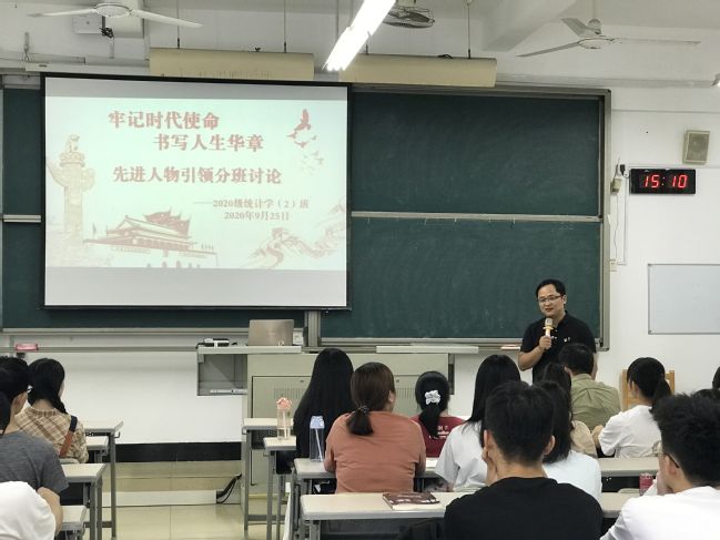 计算机与信息学院在组织2020级新生集中观看学习先进人物事迹视频后,分别于9月24日-25日召开主题班会,专题开展先进人物引领教育学习心得交流分享会。学院领导、院党委委员、新生辅导员、班主任、助理班主任分别参与各班主题班会中,与学生开展座谈交流。学院党委副书记(主持工作)张金山参加了2020级统计学(2)班的主题班会,他对同学们的到来表示热烈欢迎,对同学们提出两点希望:一是要以先进人物为榜样,敢当先进、勇当先进,并积极向身边的先进人物学习;二是要有爱国之心,把爱国和爱自己、爱家人、爱身边的人统一起来,把实现个人梦、家庭梦融入国家梦、民族梦之中。