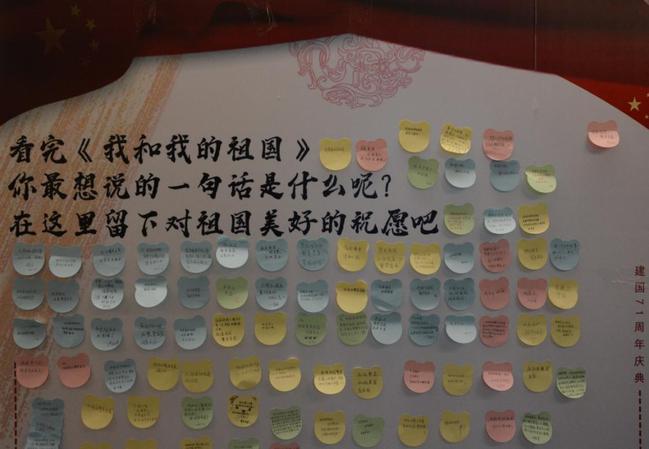 当天晚上,公共管理学院于公管楼201开展“主题系列电影观看”团日活动,组织同学们观看影片《我和我的祖国》。该电影为庆祝新中国成立七十周年贺岁电影,七部短片在书写历史背后小人物故事的同时反映大时代大事件和国家七十年间的沧桑巨变,唤起了观看电影同学的共鸣及家国情怀,十分契合国庆氛围。电影结束后,同学们在观影室外留下了自己的观后感及对祖国的美好祝愿。