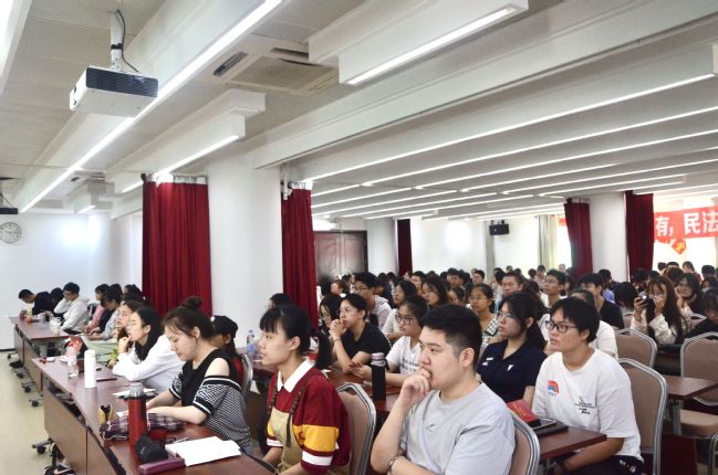 讲座现场,陈文兴老师向同学们介绍民法典的特色、重要性和编纂历程,并以《民法典》中的总则编、物权编、合同编及人格权编四方面为例,结合生活中的具体案例,以深入浅出的说理、全面准确的解读,讲解相关法律规定,使学生更好地了解《民法典》的颁布对日常生活的影响。活动现场座无虚席,同学们全神贯注地听讲,并积极参与互动,在陈文兴老师幽默风趣的讲解中加深对《民法典》的认识。