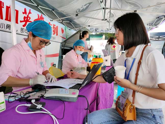 第一批志愿者于早晨七点十五分集合后搭好了活动场地。当献血车到位后,志愿者们耐心地为准备参与献血活动的同学们讲解注意事项,避免因献血引起身体不适。同学们顶着炎炎烈日有序地排队,并完成测体温、填表、体检、验血、抽血一系列献血相关的工作。 此后,志愿者为献血后的学生们准备了葡萄糖、矿泉水等物品以缓解身体不适。