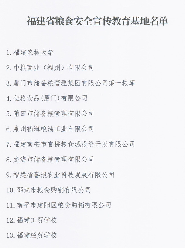 近日,福建省粮食和物资储备局、福建省农业农村厅等单位联合发布《关于授予“福建省粮食安全宣传教育基地”的决定》(闽粮办[2020]160号),在各地市推荐的基础上,择优确定了13家单位为“福建省粮食安全宣传教育基地”,我校入选该名单。
