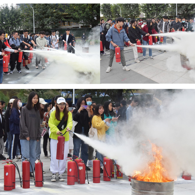 演练前,黄事煜为同学们讲解了火灾现场的应急处置方案及安全逃生方法,介绍了灭火器的构造及注意事项,并对灭火器的使用进行了现场操作示范。现场同学们认真倾听、仔细观看,在保卫办人员指导下,同学们十分沉着冷静、熟练有序地使用灭火器进行灭火练习。