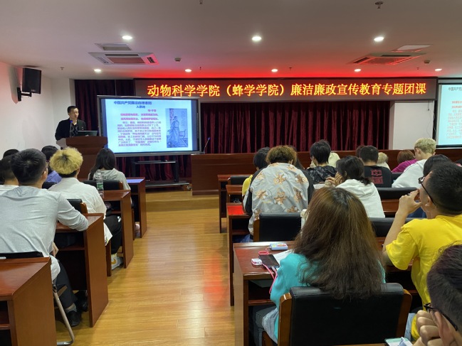 11月20日晚上,动物科学学院团委于新圣农楼七楼大会议室召开廉洁廉政宣传教育专题团课。本次团课由院团委副书记吴元华主讲,学院团学干部以及班级代表约90人参加。
