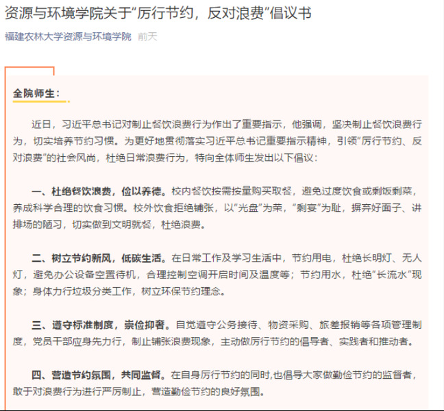 近日,资源与环境学院积极践行习近平总书记对制止餐饮浪费行为的重要指示精神,通过线上线下相结合方式组织学生开展“厉行节约,拒绝浪费”系列活动。