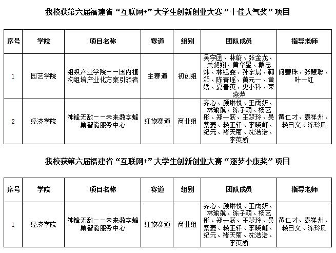 近日,福建省教育厅公布了第六届福建省“互联网+”大学生创新创业大赛获奖名单。我校获金奖3项、银奖3项、铜奖5项、“十佳人气奖”2项、“逐梦小康奖”1项,何碧珠、林碧英、杨志坚、黄仁才4位老师获“优秀创新创业导师”称号,我校获高校集体奖、“青年红色筑梦之旅”集体奖,连续6届获大赛优秀组织奖。