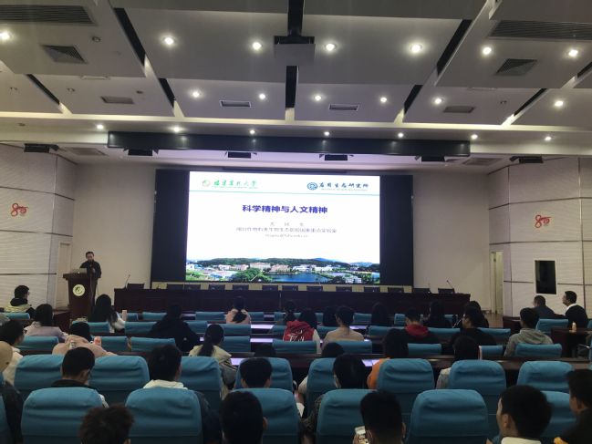 尤民生教授报告题目为《科学精神和人文精神》,他就科学精神、人文精神以及两者之间的关系进行了精彩阐述,并结合自身科研经历和心路历程,勉励青年学子和教师,要具备求实求真的科学精神,守住底线,志存高远,立志做大学问,做真学问;同时要求广大师生要弘扬人文精神,既要求实求真、又要求善求美。