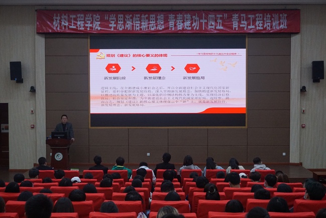 学院党委副书记苏开敏为青马班作题为《学习贯彻党的十九届五中全会精神,争做勇担重任的新时代青年》首场辅导报告。苏开敏紧扣党的十九届五中全会主题,全面回顾了五中全会召开的历史背景、“十四五”规划《建议》起草过程、构成以及亮点,从深刻认识全会重大意义、全面建成小康社会取得的决定性成就和准确把握二〇三五年远景目标等多个方面,对五中全会精神进行了系统解读,结合学生工作实际对新发展阶段、新发展理念、新发展格局等方面进行全面深入阐述。他指出广大学生党员、学生干部要持续不断学习习近平新时代中国特色社会主义思想,坚定马克思主义信仰,成为具有忠诚的政治品格、浓厚的家国情怀、扎实的理论功底、突出的能力素质,忠恕任事、人品服众的青年政治人才,争做勇担重任的新时代青年。
