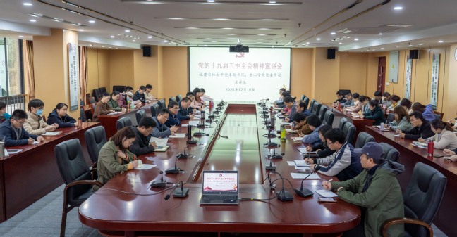 12月7日,校党委常委、副校长林庆藩来到农资系教工党支部宣讲党的十九届五中全会精神,并与支部党员教师开展交流座谈。林庆藩强调,要准确把握全会精神以及核心要义,把学习贯彻全会精神与学习贯彻习近平总书记教育重要论述紧密结合,与推进新时代教育评价改革紧密结合,以立德树人为根本,不断提升教育教学水平,推动学校高质量发展,不断为国家培养高素质有情怀的农林人才。要发挥党支部战斗堡垒作用,进一步带领党员教师深入学习贯彻党的十九届五中全会和习近平总书记教育重要论述精神,抓住大好机遇,齐心协力谋发展;党员教师要积极发挥先锋模范作用,为学校事业高质量发展做出贡献。