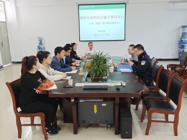 3月16日上午,林学院邀请淮安派出所所长陈超为学院政工干部举行预防电信网络诈骗专题培训会。培训会由院党委副书记李梅生主持。