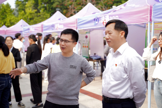 校党委副书记曾华平到终审决赛现场认真查看作品展板并与参赛同学亲切交谈。曾华平高度肯定了我校学生的作品创新性与操作独立性,勉励同学们发挥专业特长,加强创新创造,为建设科技强国贡献青春力量。