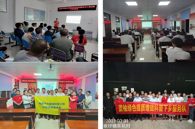 支部师生党员先后深入平和县五星村、东坑村、仁山村、东风村、心田村等地举办了以“化肥减量、改土调酸、绿色种植、提质增效”为内容的系列科普培训活动。培训活动上,支部师生党员通过图文并茂PPT方式向当地柚农详细介绍了蜜柚养分综合管理的绿色种植技术,并现场耐心解答当地柚农种植蜜柚过程碰到的难题和疑惑。