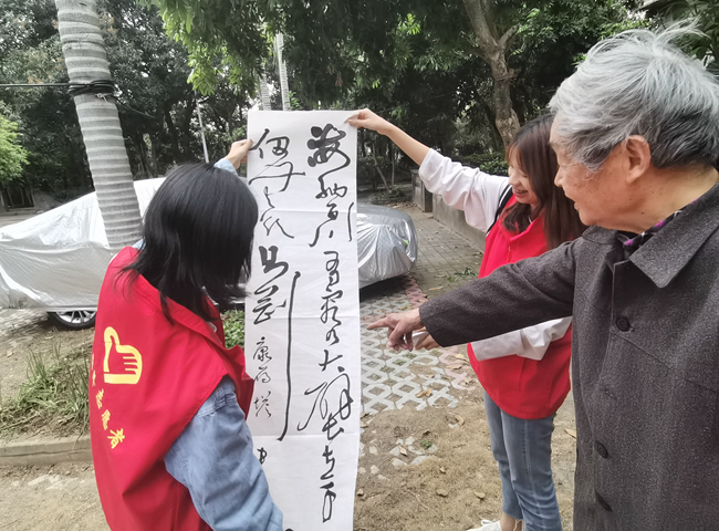 活动现场气氛热烈,志愿者们还策划了“党史学习教育”知识竞答小游戏,并制作了DIY手链等小礼品,赠送活动现场的老年朋友们。中国书画家协会会员、开元kaiyuan(中国)学生书美协会顾问康雁塔老师还现场临摹展示了书法作品,向大家分享自己的创作故事,带大家感受中华传统文化的魅力。