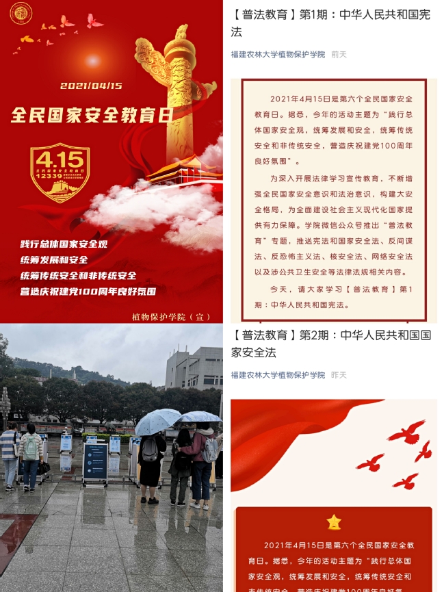 加强安全教育宣传。4月13日起,学院微信公众号推出“普法教育”系列专题推文,至今共发布3期专题推文,包括总体国家安全观的内涵和《中华人民共和国宪法》《中华人民共和国国家安全法》《中华人民共和国反间谍法》等法律法规,普及国家安全教育知识。同时,学院在户外宣传栏张贴第六个全民国家安全教育日宣传海报,大力营造国家安全宣传教育氛围。
