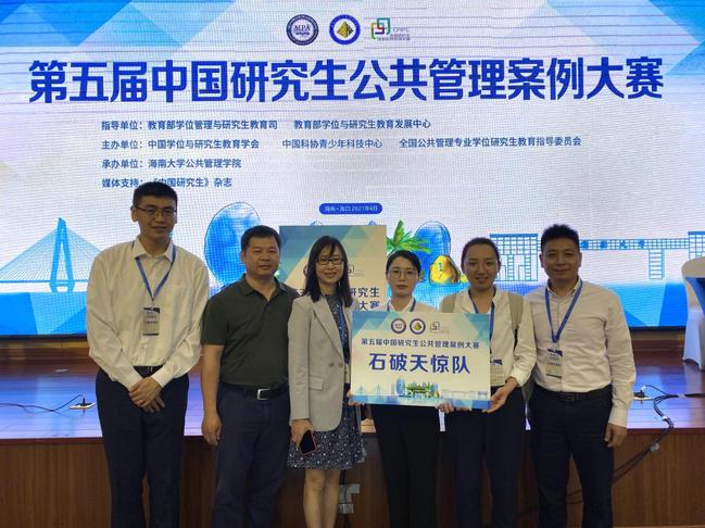 4月25日,由中国学位与研究生教育学会、中国科协青少年科技中心、全国公共管理专业学位研究生(MPA)教育指导委员会主办,海南大学公共管理学院承办的第五届中国研究生公共管理案例大赛总决赛在海南大学举办。公共管理学院“石破天惊队”参赛案例《文明的较量:保护与发展之困——万寿岩史前遗址历险重生记》获得二等奖,是我省在本届大赛中获得的最高奖项。该案例由公共管理学院杨国永、叶飞文、陈智军、郑永平指导,2020级公共管理学术型硕士研究生蒋羽宁,MPA研究生林城、章莹、林依依、方玲燕共同完成。公共管理学院连续第四次获优秀组织奖。