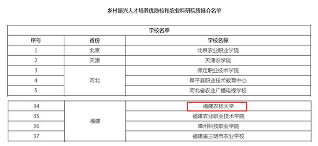 据悉,此次推介工作是农业农村部、教育部为推动形成乡村人才振兴合力,调动全国涉农高校、涉农职业院校、农业科研院所进一步发挥优势,创新人才培养形式,加快培养适应农业农村现代化的乡村人才队伍联合开展的。此次推介乡村振兴人才培养优质院校,按照“广泛推荐、优中选优、引领示范”的原则遴选,经院校自荐、省级推荐、专家评审等环节产生的。自2020年11月开始申报,2021年5月公示,全国最终确定了98所院校和3所研究院所,福建省有4所院校入选。