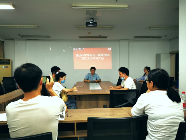6月1日晚上,食品科学学院在学院会议室召开毕业生国家助学贷款诚信教育大会。会议由学院资助联络员陈文滔辅导员主持,采用线上线下同时开展的方式进行,四十多名获国家助学贷款资助的毕业生参会。