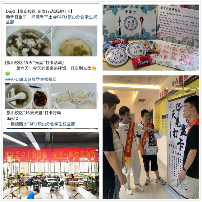 通过宣传标语、线上打卡、答题集章、志愿者现场劝导等多种方式,引导广大同学参与有关节约、环保、权益等方面的知识答题,分享个人“光盘”行动照片,大力营造节约食物、文明用餐氛围。