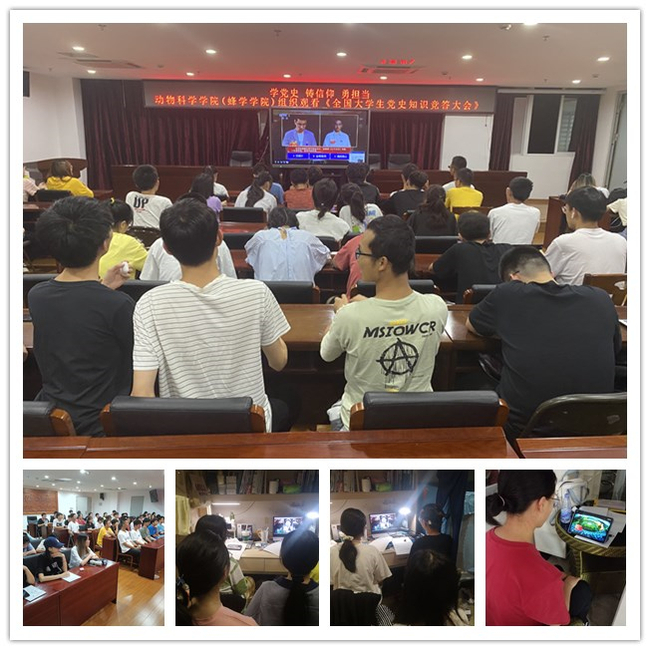 6月7日晚上,动物科学学院(蜂学学院)组织学生在线观看由央视综合频道、央视频、央视网同步播出的全国大学生党史知识竞答大会。学院各班级代表80余人在新圣农楼7楼会议室集中观看,各班级也组织同学在实验室、宿舍、图书馆自行通过移动设备观看。