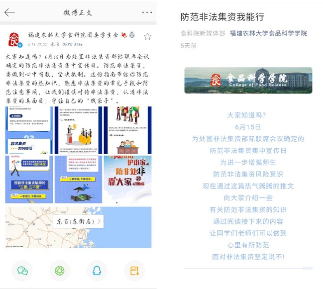为进一步增强师生防范非法集资风险意识,6月15日-6月27日,食品科学学院组织开展线上与线下相结合的系列宣传教育活动。