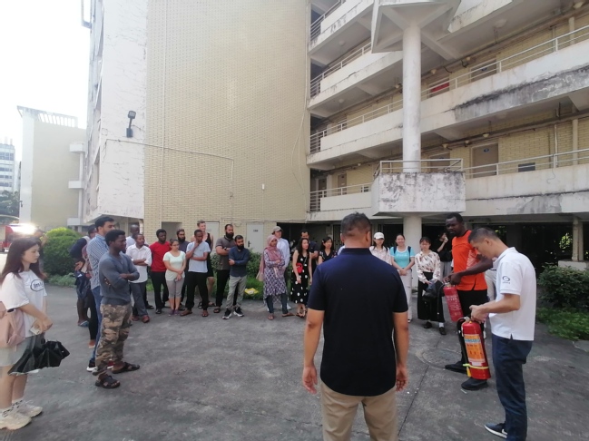 为进一步提高中外学生消防安全意识和火灾防范自救能力,国际学院联合校保卫处于7月3日上午在北区来华留学生公寓开展消防安全教育演练。