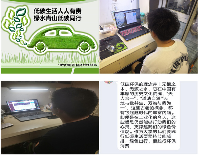 开展主题团日活动。学院组织各班级团支部通过线上线下相结合方式开展“低碳生活,你我同行”主题团日活动。各班级团支部通过PPT宣讲、视频播放、小组讨论等形式向同学们宣讲垃圾分类、节约粮食、绿色出行等方面内容。活动期间,同学们踊跃发言,畅谈自己对绿色低碳生活的理解。通过团日活动开展,加深同学们对绿色低碳生活的认识,有助于他们进一步树立了自然、环保、节俭、健康的思想观念和生活方式。