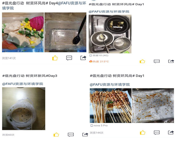 开展光盘打卡活动。学院组织全院学生开展“倡光盘行动,树资环风尚”线上打卡活动。学院学子积极响应学院号召,每位同学都能按需点餐,不留剩饭剩菜,做到碗中不留一粒米,盘中不留一棵菜。同学们在用餐后纷纷晒出自己的“光盘”照,通过实际行动拒绝“舌尖上的浪费”,践行勤俭节约的优良传统,聚合崇俭抑奢的社会正能量。此次主题活动不仅使“节约光荣,浪费可耻”的观念在校园蔚然成风,更增强资环学子珍惜粮食,杜绝浪费的意识。