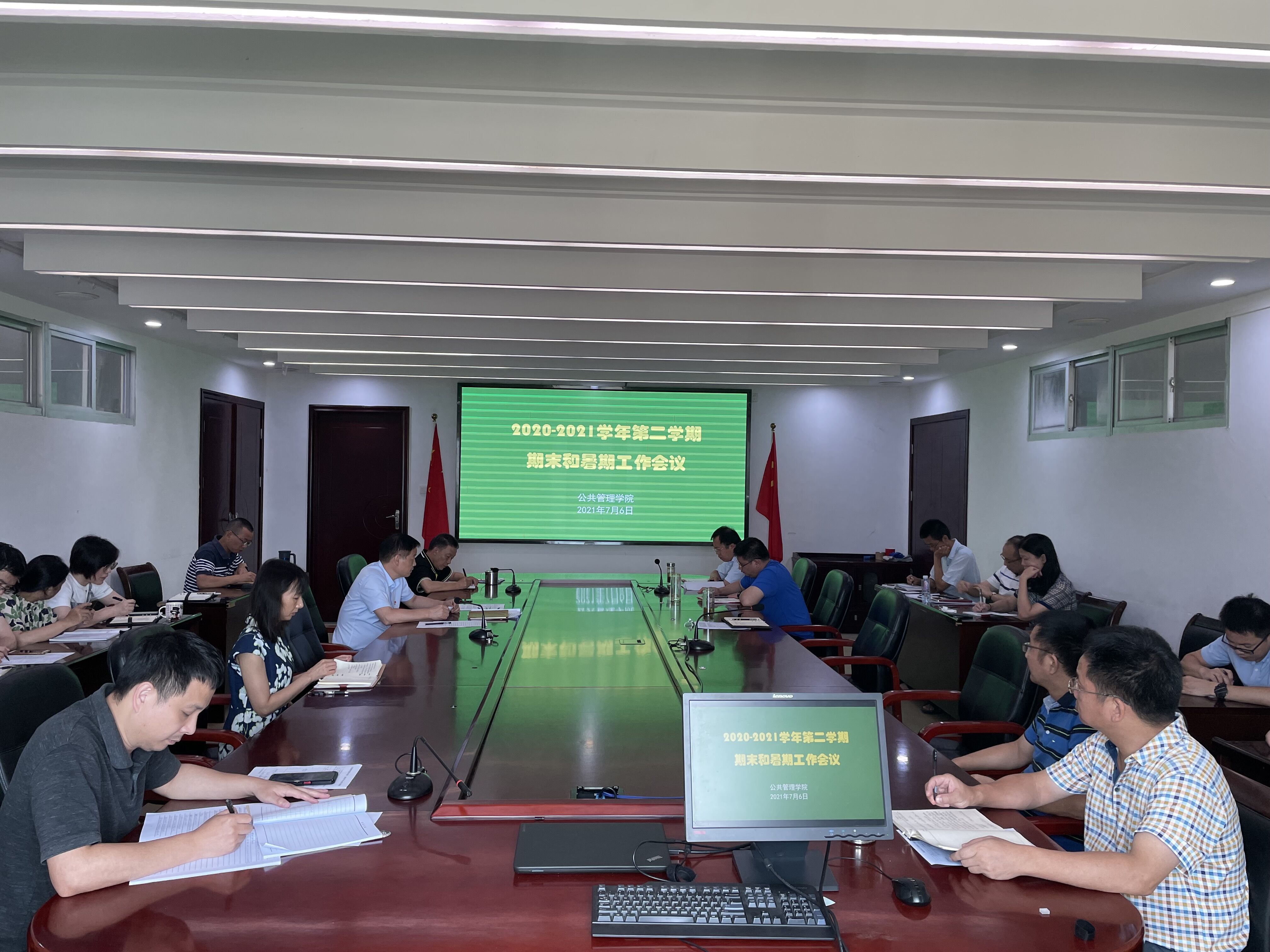 7月6日上午,公共管理学院在东苑10号楼512会议室召开期末和暑期工作会议,学院领导班子、各系部主任、支部书记及政工干部参加会议。会议由学院党委书记曾起郁主持。