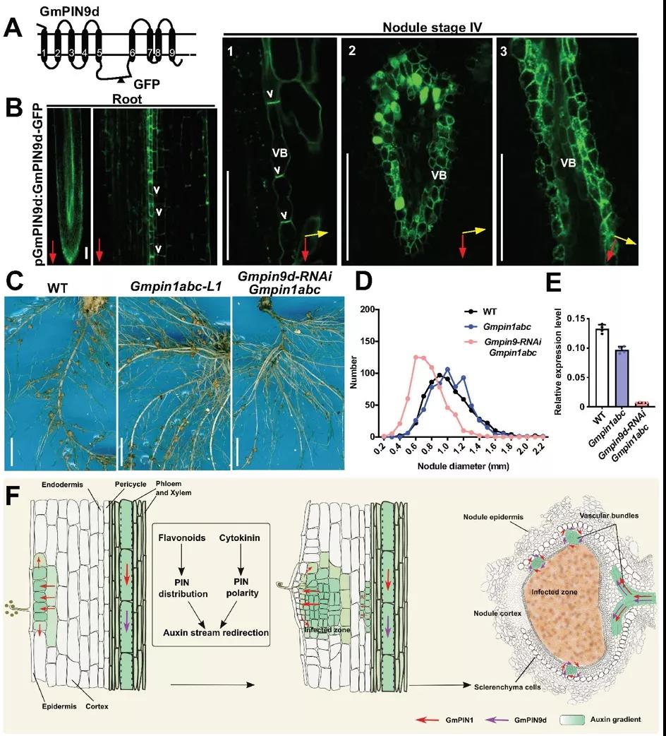 此外,GmPIN9d是拟南芥PIN2的同源蛋白,在根和根瘤之间的合生维管束内积累。经鉴定发现,GmPIN9d依赖性生长素运输在根瘤发育后期阶段发挥功能,并与GmPIN1协同作用以在维管束内向顶端方向运输生长素,精细调控生长素供应以促进根瘤增大(图3)。