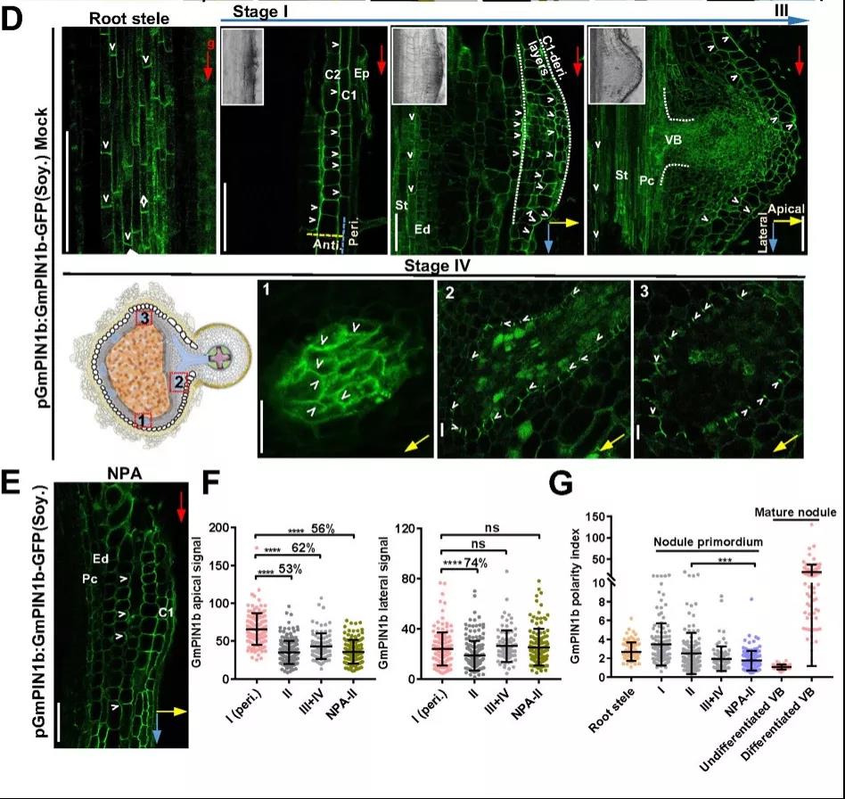 进而,本文针对大豆中进化出的23个GmPIN基因,鉴定获得了特异在根瘤原基发生区域特异表达的GmPIN1成员。GmPIN1b, c, d在根瘤原基起始期间的原基细胞中特异性表达,通过对根瘤发育过程中GmPIN1b在根瘤细胞中极性动态研究表明其参与定向生长素运输以促进根瘤原基形成(图2)。