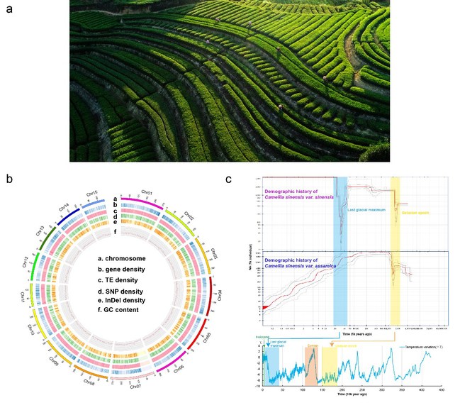附图说明:(a)福建省安溪县云岭茶庄园;(b)铁观音单倍体参考基因组circos图,呈现15对染色体特征;(c)茶树的群体动态历史。