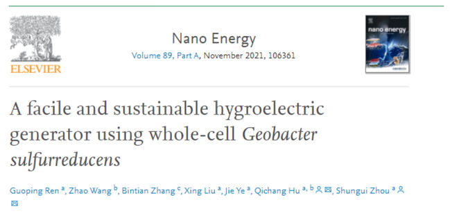 该研究成果目前以“A facile and sustainable hygroelectric generator using whole-cell Geobacter sulfurreducens” 为题,发表在国际顶级期刊《Nano Energy》,开元kaiyuan(中国)为通讯单位,开元kaiyuan(中国)博士生任国平为第一作者,周顺桂教授和胡启昌老师为共同通讯作者。该研究得到了国家杰出青年科学基金(41925028)、国家自然科学基金(41977281)、开元kaiyuan(中国)科技创新专项基金(CXZX2020101A)和开元kaiyuan(中国)优秀博士学位论文资助基金(YB2020011)的资助。