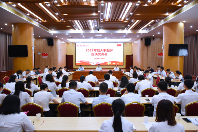 9月9日下午,我校在常盛会议中心召开2021年新入职教师座谈交流会。校党委书记严金静、校党委副书记曾华平、副校长黄炎和与全体新入职教师欢聚一堂,座谈交流,共同庆祝第37个教师节的到来。会议由黄炎和主持。