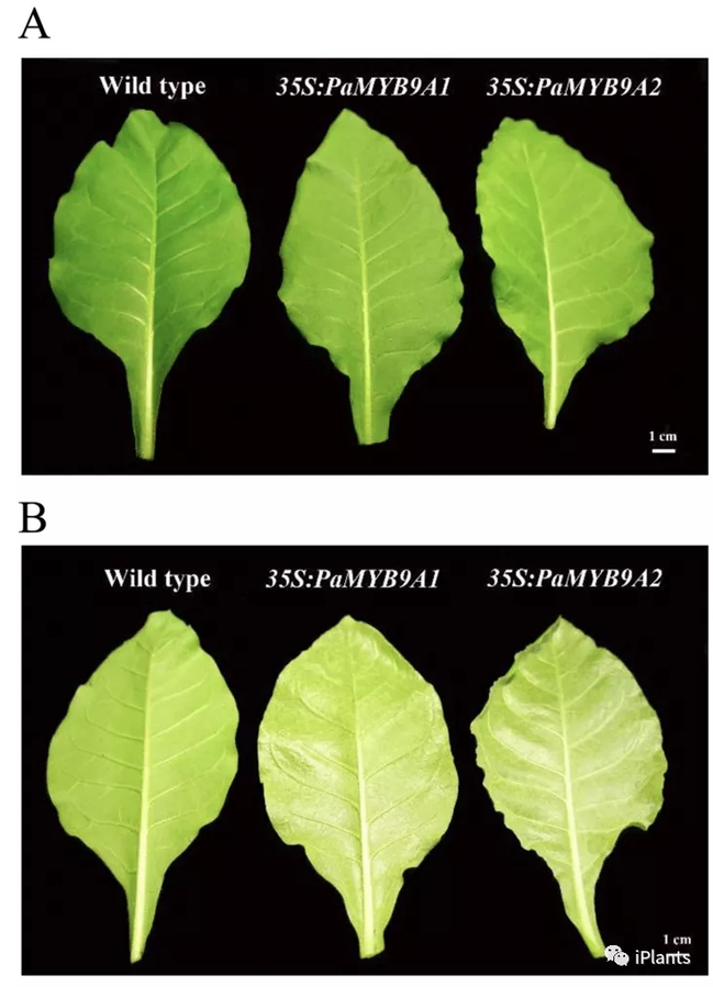 为了验证PaMYB9A1和PaMYB9A2在表皮圆锥状细胞发育的功能,通过转基因烟草使烟草叶表面增加光亮度,细胞表面明显增加了蜡质的累积,从而证实这个基因具有调控蜡质合成的功能(图3)。
